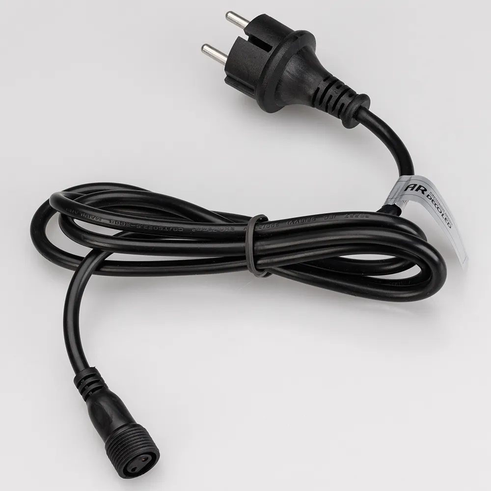 Шнур питания для светодиодных гирлянд ШАРИКИ, НИТЬ c эффектом МУЛЬТИКОЛОР. Материал оболочки каучук. В комплект входит: шнур питания с вилкой европейского стандарта, разъём подключения к гирлянде. Цвет провода чёрный. Длина провода 1.5 метра.