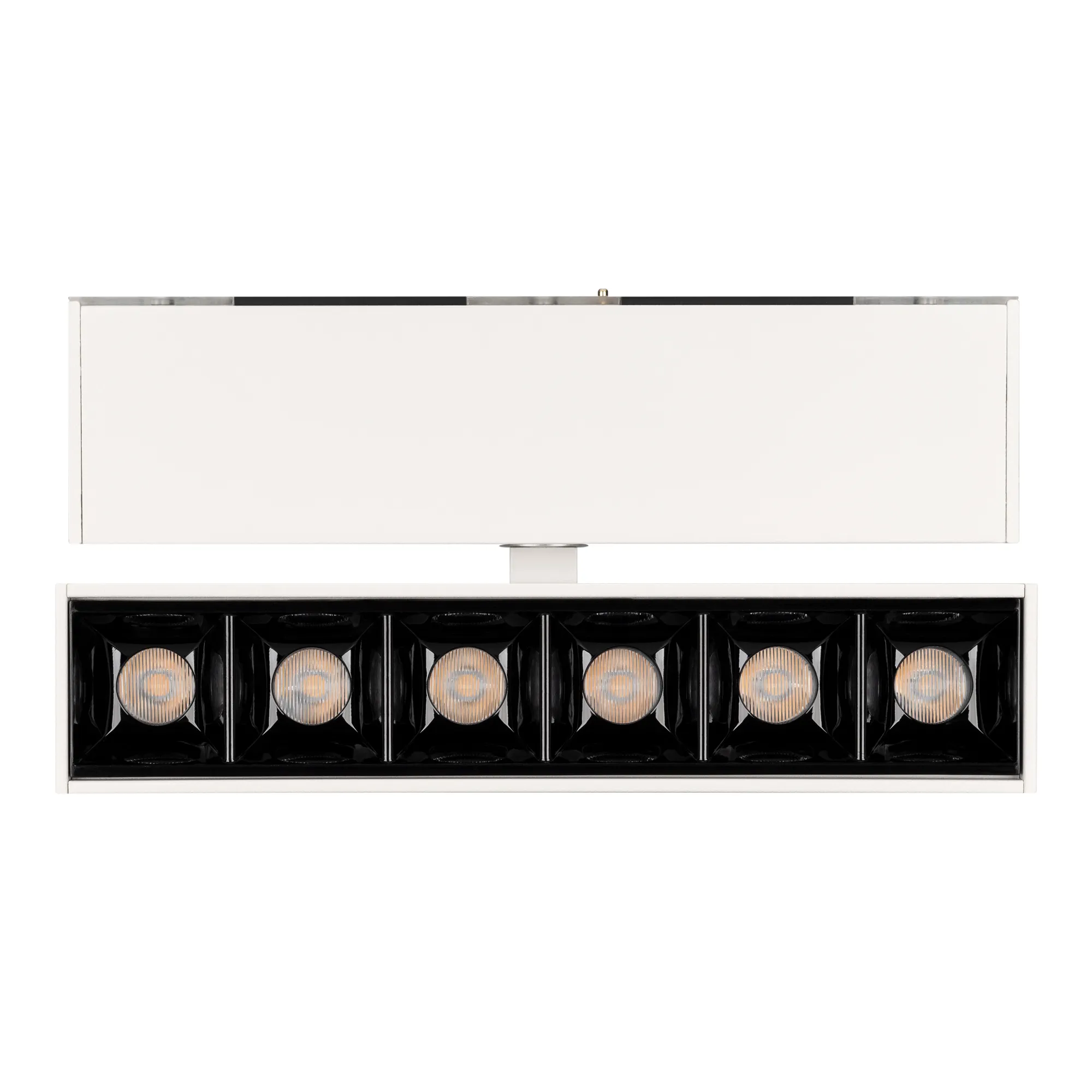 Светильник поворотный для магнитных треков шириной 45мм, 6Вт. Цвет свечения ТЕПЛЫЙ 3000K, световой поток 400лм, угол 15°, CRI>90. Корпус прямоугольный, металл, цвет белый, IP20. Размеры LxWxH 163x35x92.5мм. Входное напряжение DC24V, мощность 6Вт. Драйвер DС24V/AC230V поставляется отдельно. Диммируется только с 026407(1), 027633.