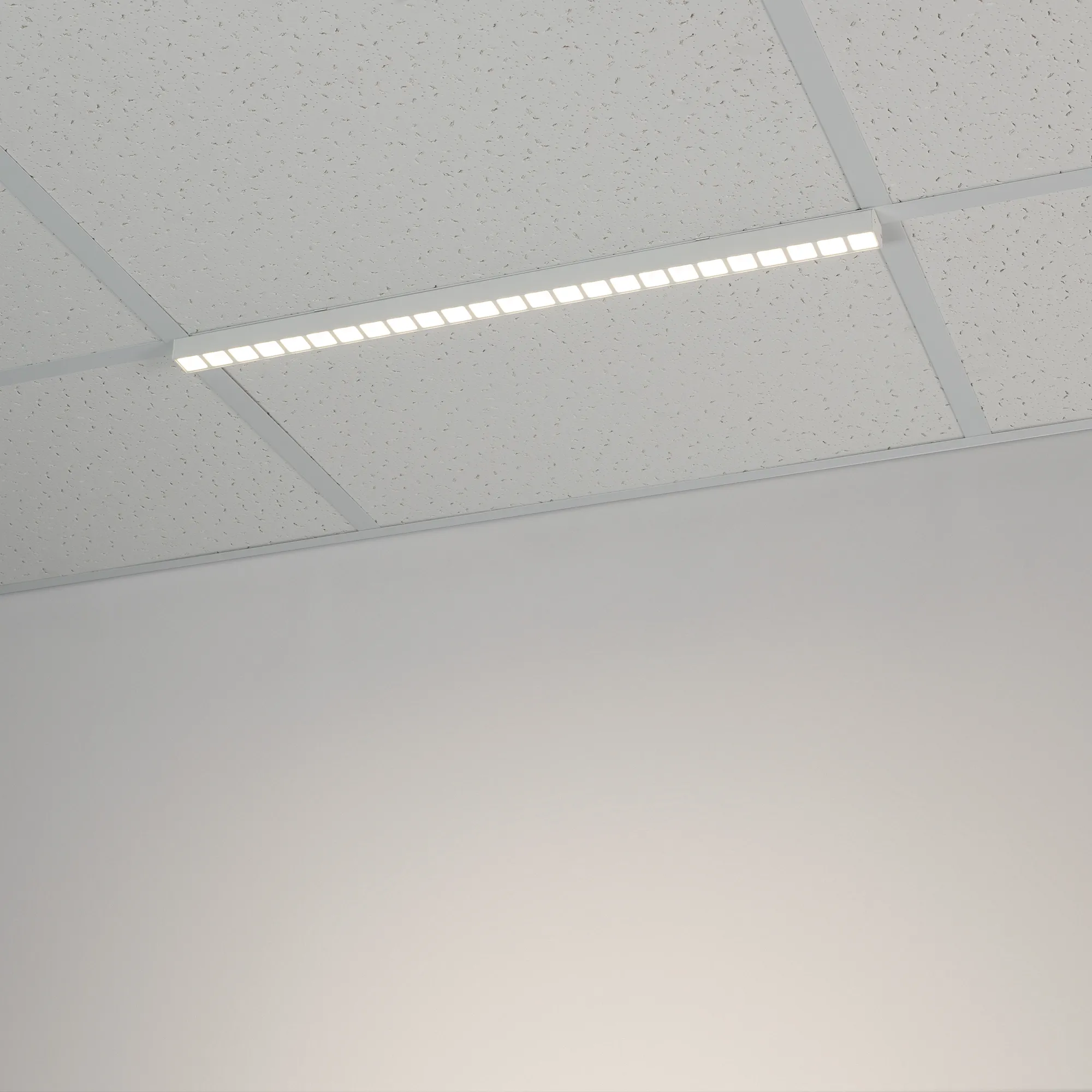 Светодиодный светильник для направляющих потолка Армстронг шириной 15 и 24 мм. Мощность 14 Вт, св. поток 1620 лм, 115 лм/Вт, дневной 4000K, CRI>80, угол 80°, напряжение питания 48 В. Белый квадратный корпус из алюминия, экран PC, степень защиты IP40. Размер: длина 600 мм, ширина 25 мм, высота 28 мм. Монтаж накладной. Драйвер поставляется отдельно.