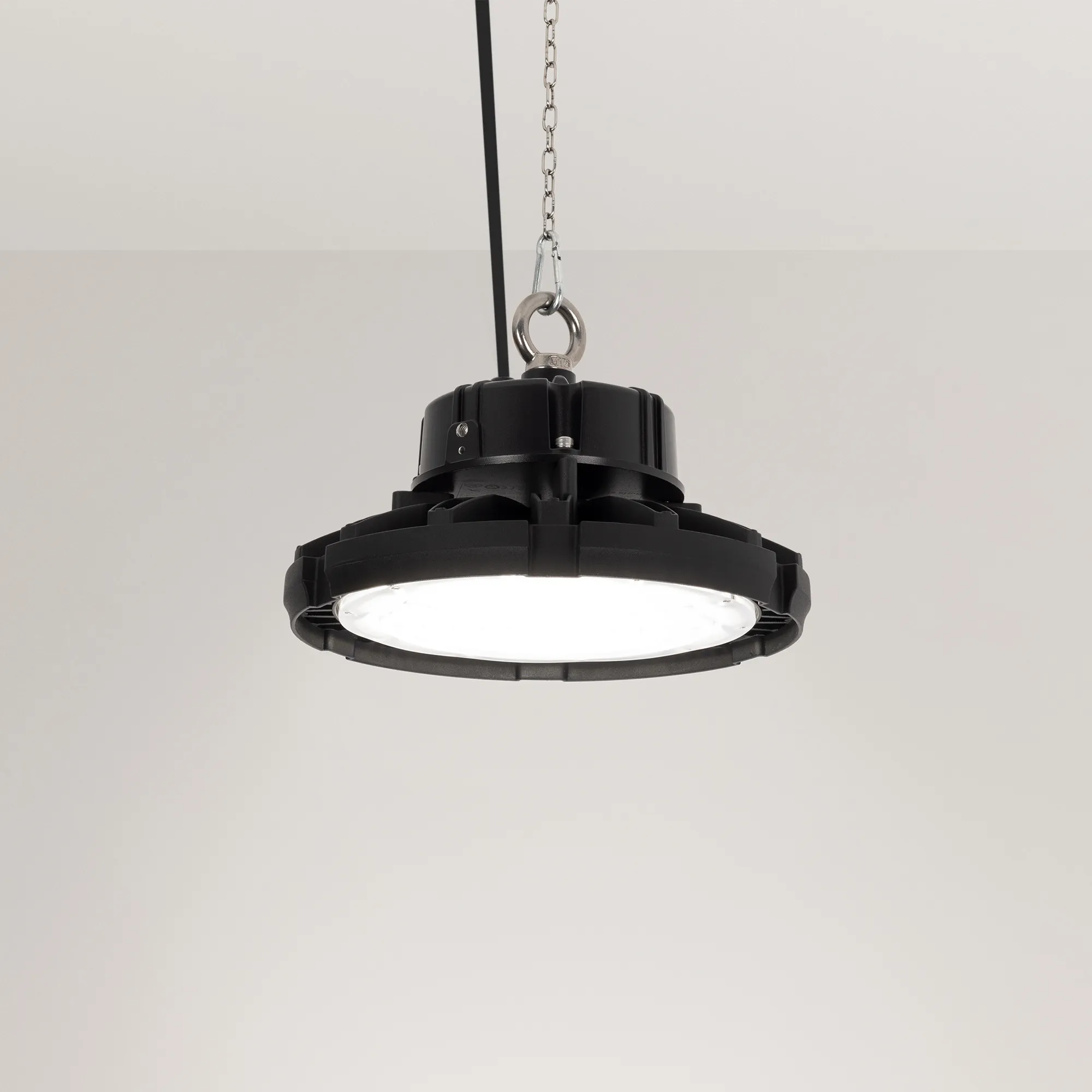 Поставка под заказ от 250 шт. Светильник для освещения складских и промышленных помещений. Мощность 200W, напряжение питания AC 220-240V/50Hz. CRI 80. Тип светодиодов SMD2835, с групповой оптической линзой. Цвет свечения ДНЕВНОЙ 5000K, световой поток 28000 Lm, угол рассеивания 90°. Цвет корпуса черный, линза из поликарбоната, степень влагозащиты IP65. Габариты Ф320xH197мм. Рым-болт в комплекте.