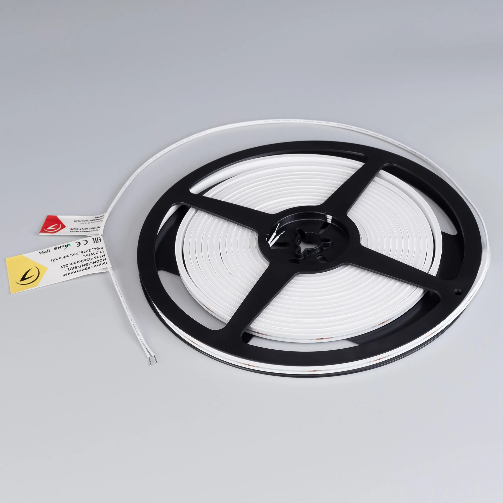 Гибкая герметичная лента (неон серии MOONLIGHT), сечение 3×6 мм. Светодиоды SMD 2216 196 шт/м. Цвет свечения ТЁПЛЫЙ (2700 К), индекс цветопередачи CRI>90, световой поток 170 лм/м, угол излучения 112°. Мощность 7.2 Вт/м, питание 24 В. Класс пылевлагозащиты IP54. Размеры 5000×3×6 мм. Мин. отрезок 35.7 мм. Горизонтальный изгиб SIDE, минимальный радиус изгиба 30 мм. Кабель питания длиной 500 мм, вывод с двух сторон вдоль линии сечения неона. Катушка 5 м. Цена за 1 м. Гарантия 3 года.