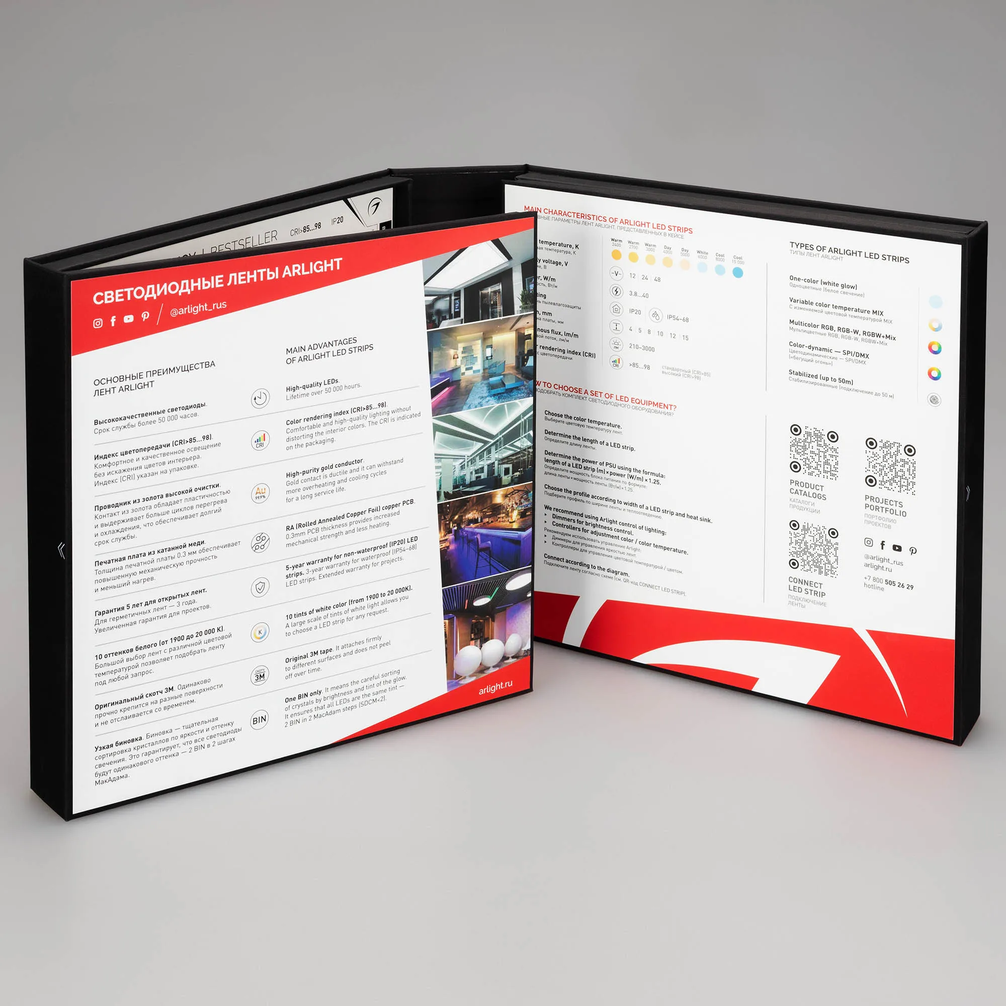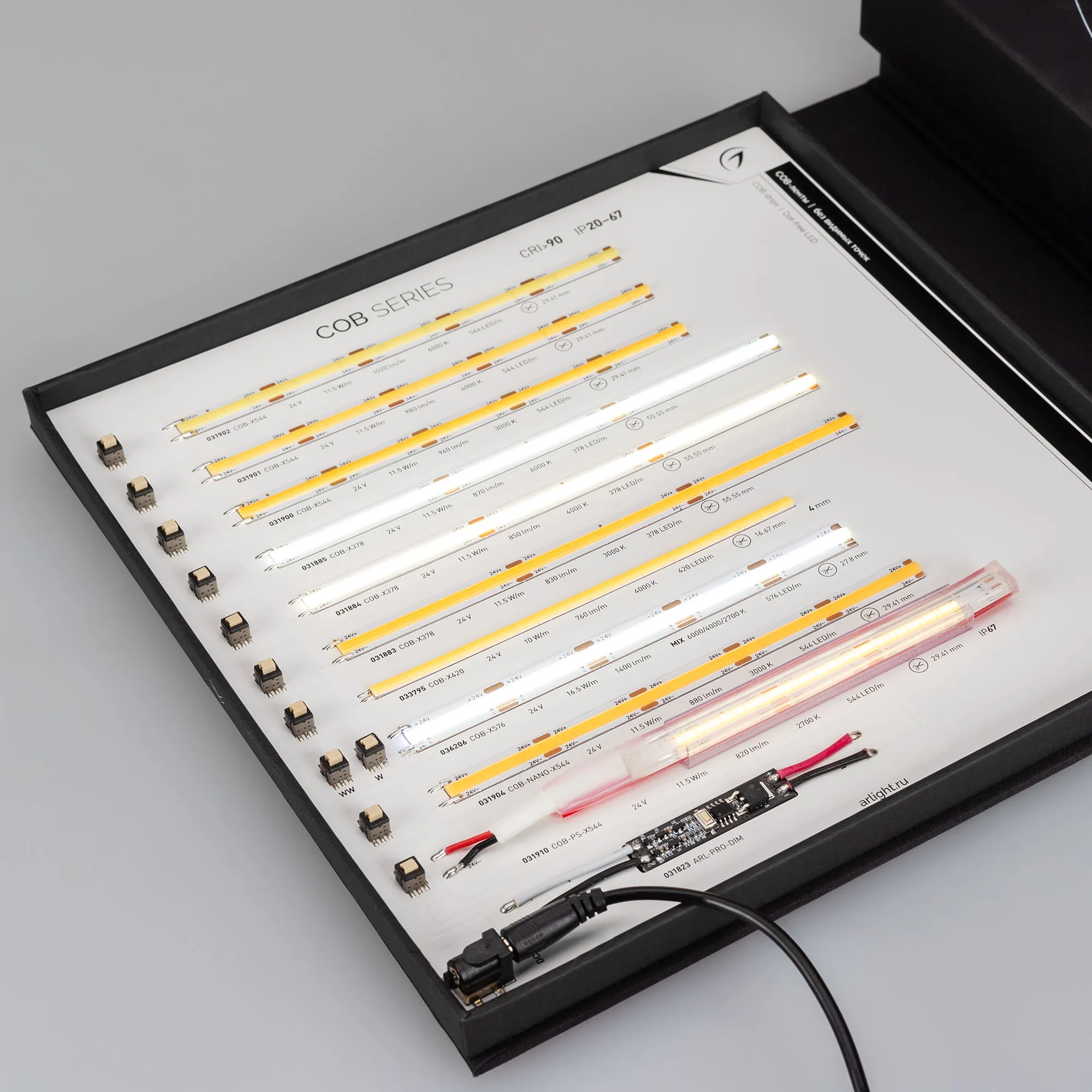 В кейс входят 42 образца моделей лент COB, RT, MICROLED, IC, MIX, SPI, DMX.