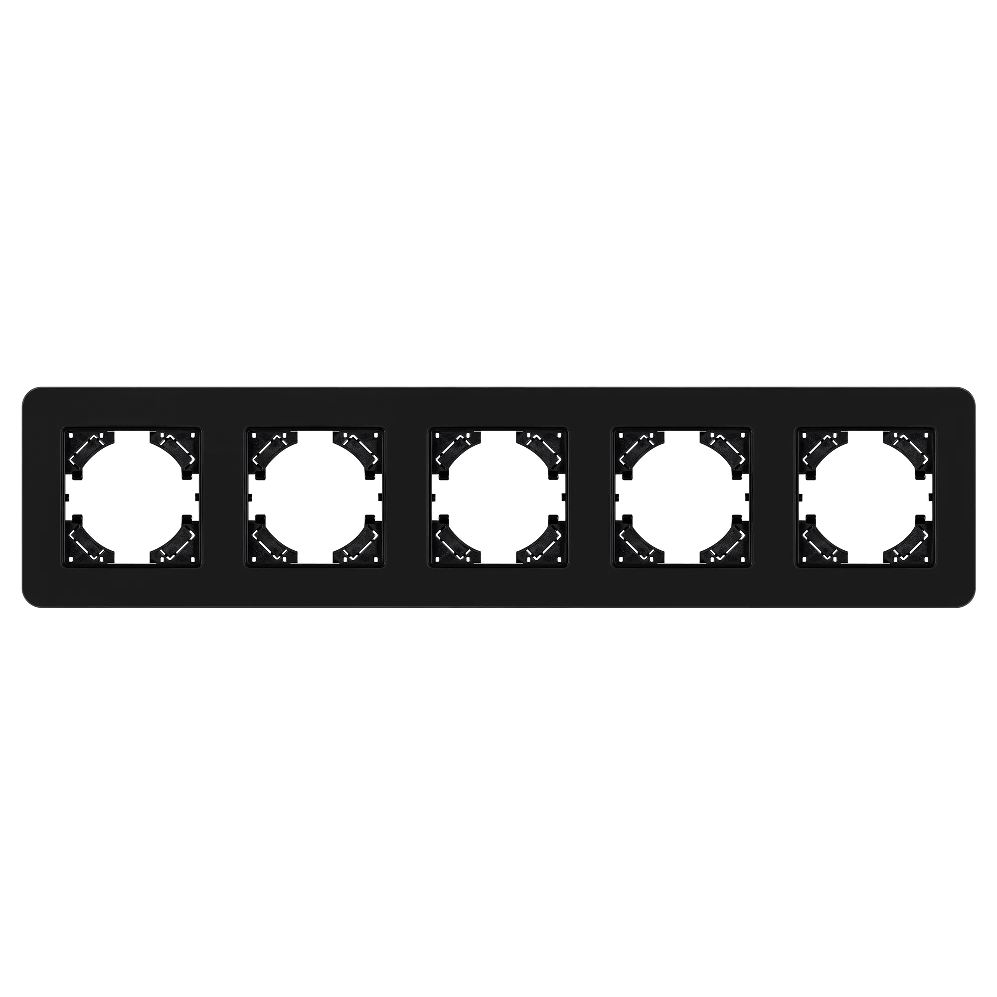 Рамка стеклянная на 5 постов, под встраиваемый механизм. Цвет - черный с Soft-Touch покрытием. Среднего уровня герметичности IP20. Ориентация монтажа - горизонтальная (основным ориентиром служат посадочные выступы для накладки механизма).