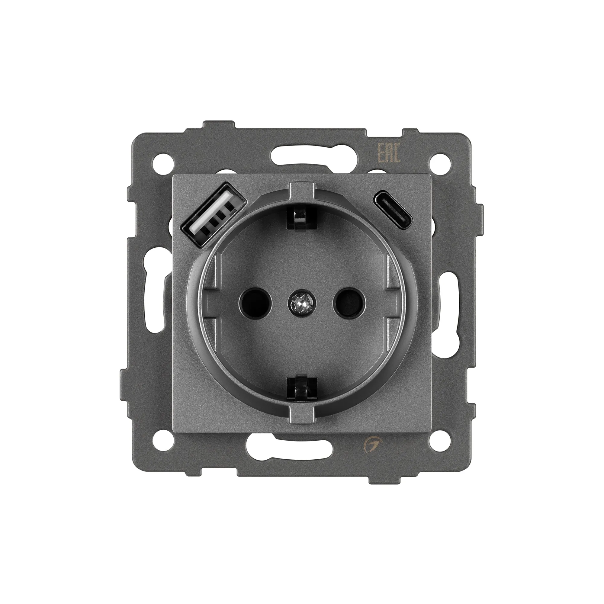 Механизм розетки с заземлением 1 пост 2 USB Type A+C порта. Цвет - серый. Без фронтальной рамки. Уровень пылевлагозащиты IP20. Устанавливается в стандартный подрозетник.
