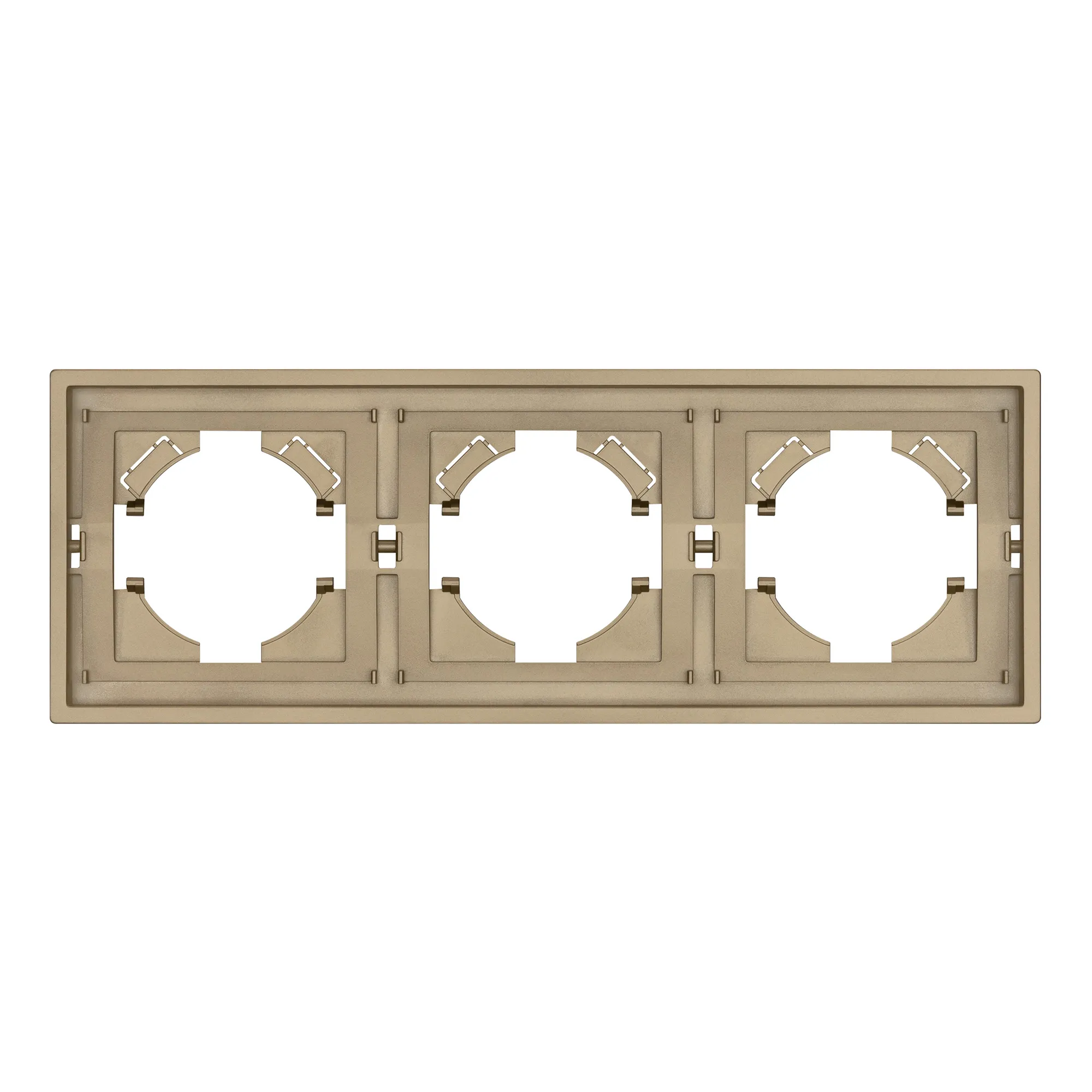 Рамка пластиковая на 3 поста, под встраиваемый механизм. Цвет - золотой, с Soft-Touch покрытием. Среднего уровня герметичности IP20. Ориентация монтажа горизонтальная.